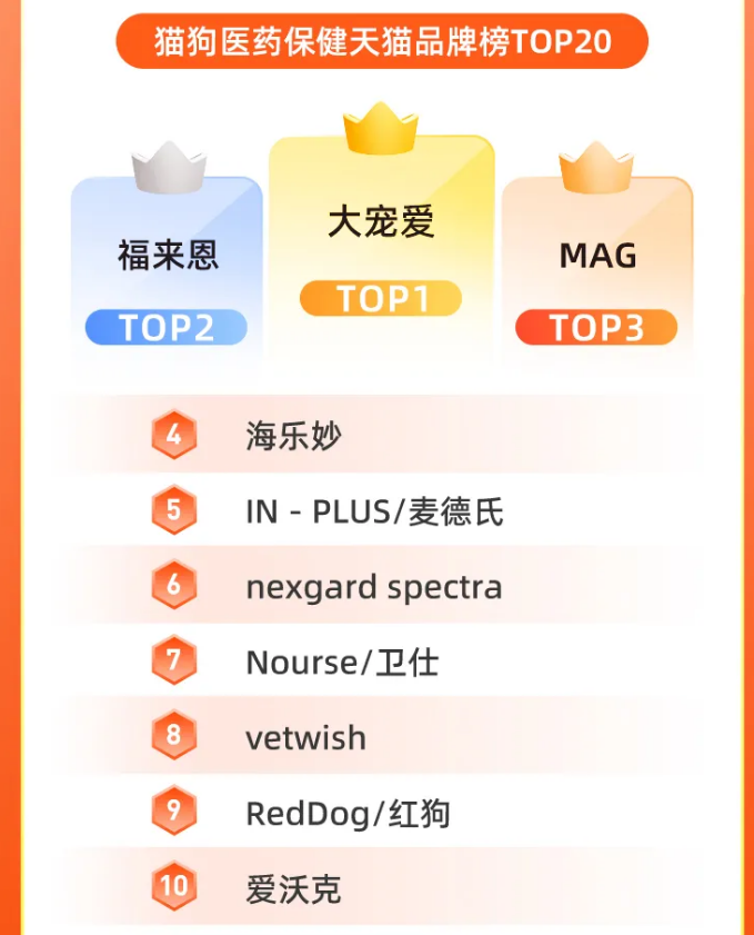 本年618天猫预售首日猫狗医药保健天猫店肆榜TOP10里的卫仕、红狗,都是建立跨越10年,从建立早期至今一直专注宠物养分保健赛道的品牌。